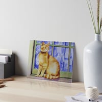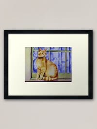 Ginger colored cat in a window with lace curtain behind the subject. "Rusty the Cotswold Cat" so named because while on a visit in Britain I saw a cat like this and was inspired to create this painting